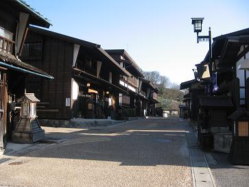 木曽町『江戸小路』上の段。木曽の街中のベタなスポットです。夜はライトアップで幻想的な雰囲気になります。『高礼場』付近。少し前なので、桜が真っ盛りです。