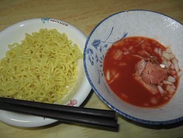 『トマトジュースつけめん』自作ある方のブログで、トマトジュースを出汁にした案をアップしていましたので、試みてみました(*^。^*)あ、そのブログでは素麺でしたが・・・今回は、つけ汁はトマトジュース(加塩)のみ。味付けのために、チャーシューでなく、ベーコンを炙ったものをイン。そして、たまねぎを。結論は、このままでは・・・(^^ゞこれから、出汁の配合を考えていきたいと思います。
