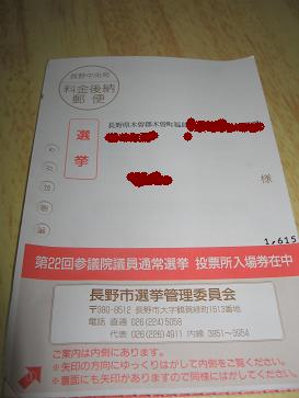 7月11日は、第22回参議院議員通常選挙です。σ(・_・)のところにも、『投票所入場券』がきました。何も気にしていなかったのですが、ふと、違和感が・・・なんで、長野市選挙管理委員会??σ(・_・)木曽なのに・・確かめてみると、選挙3ヶ月前の選挙管理委員会の名簿が採用されるため、4月転居のσ(・_・)は、長野が拠点となるらしい・・σ(・_・)が投票するには、長野市に『投票用紙等請求書兼宣誓書』を、郵送で送る。長野市選挙管理委員会から投票用紙が郵送されるので、それを持って、町の選挙管理委員会に出向いて、不在者投票をするようになる。らしい・・・σ(・_・)は、投票できるのか・・・