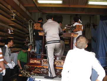 先週の帰省時のことです。信州に戻る日(日曜日)だったのですが、その日は秋祭りの『屋台(やったい)』を、組み立てるとのこと。朝の9時からやっているそうですが、11時の訪問時には、まだ屋根も設置できていません(^^ゞ2年前に30年ぶりくらいに新調したのですが、今年、ようやく屋根に漆が塗られました。なんて美しい黒光りでしょう(^。^)訪問から40分位して、ようやく屋根を置くことができました。これは、屋根と擬宝珠(ぎぼし)の間の飾りです。信州に帰る出発までには完成できず、です。10月21・22日の『魚吹(うすき)八幡神社』の秋祭りには、絶対に帰ります。だって、甥っ子(走りがビリ)が乗り子ですから。(屋台の中に乗り、4人で太鼓を敲きます)