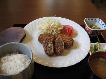げんき茶屋『メンチカツ定食』800円木祖村道の駅 内の第3弾。このメニューも肉がいっぱいです。ただ、ガッツリ系ではなく、メンチ=肉汁ジューシーではありません。具材を薄いカツの膜で包んだような感じです。混ぜ合わされているのもキャベツで、今までに感じたことの味わいです。ガッツリいきたい方は、お変わり自由なので、いっぱい食べてください(*^。^*)