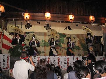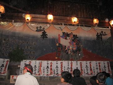 諏訪神社例祭『芸ざらい』上松町上松若宮八幡宮9月2日(木)八幡宮境内で、昨夜、芸8題が演じられました。『八百屋お七』八百屋「お七」の家族は大火に見舞われ、家を建てる間あるお寺に避難をしていた。お七はそこの小姓「吉三」に恋をしてしまう。その後、お七は吉三に遭いたい一心で我が家に火を放ってしまう・・・・『伊奈川鉄ヶ獄』明日の土俵は、強敵鉄ヶ嶽をむかえ、伊奈川は、ひいきの若旦那への義理から、負ける覚悟を。夫の顔が青ざめているのを見て、女房「おと」は事情を察し、本心を聞き出そうと苦労・・・・最初の2演目は舞のみで表現されるため、素人には厳しいです(^^ゞ説明が、もっと欲しいですね・・・はっきり言って、事前に飲んだお酒と、疲れと会場の暗さで、眠さとの戦いでした(^^ゞ演目の中では、女性である登場人物が、獅子の姿をしています。女性は獅子ということでしょうか・・・しかし、木曽の山中で歌舞伎が伝承されていますが、外部に発信されず、地元の観客のみです。木曽の中には面白い物がいっぱいあるのに、あまり、外には知られていないんですよね。もったいないですね。残りの演目は、今後に。