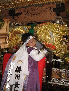 σ(・_・)の甥っ子です。今年の『魚吹(うすき)八幡神社』の地元の村の、屋台の太鼓をたたく乗り子の大役を果たしました。10月21日(木)の昼宮(村練り)始まり前です。σ(・_・)の時は、中学1年生で乗っていましたが、今では、小学6年生が乗るようになっています。ただし、希望者がです。だって、着物が○○万円ほか、結構な金額が必要になります(^^ゞ祭りでは、まわしを締めて、そろいの法被で決めます。村の中を練る時には、観客は少なめです・・・翌日22日の宮入りが、大きなイベントとなっています。 つづく