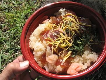『てこね寿司』500円伊勢志摩の名物料理。鰹(かつお)のヅケです。今日の木曽町日義で開催された『第10回木曽駒高原きのこまつり』でゲッチュ(*^。^*)お昼近くに訪問したら、ほとんどの商品はなく、このお寿司も、残り数個でした(^^ゞ会場に来た方は、何かを買いたいみたいなのですが、品物がない状態です。木曽の人って、イベント下手だよね・・・会場は、こんな雰囲気でした。