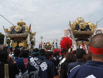 姫路の魚吹(うすき)八幡神社の報告2です。朝早くから、地元部落からお宮に向かいます。そして、宮入りする前に、屋台(やったい)を西の馬場に並べ、休憩します。今年も、18部落から全て出ました。向かいにも、並んでいます。この3台のお神輿に、神様が乗っていただきます。壇尻も3台の出場です。σ(・_・)のお宮の祭り、出場台数が多すぎるため、朝から夜中までです。当日も、朝6時に出たのですが、家に戻ったのは夜中の2時を過ぎました(^^ゞ
