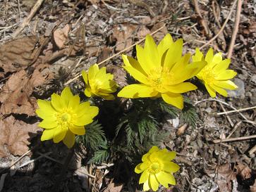 『福寿草』木曽町福島の伊谷地区で見つけました。群生とまではいきませんが、広場にちらほらと咲いていました(*^。^*)