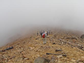 昨日の御嶽登山は、頑張って登ったのですが頂上付近は霧でした(T_T)剣ヶ峰に向かう途中。うーーん、晴れろーって祈ってましたが、頂上でも、二の池が見えない状況。雨にあうこと避け、早めに下山。途中の晴れ間でも、こんな状況(^^ゞ王滝山頂にある避雷針。既に、役目を終えています。年間、何回役目を果たしているのでしょうか?おそらく、過酷な労働環境下と。