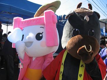 木曽牛のイメージキャラクター『きそまる』が関所祭りに初参加しました(*^。^*)(右が『きそまる』ですよ・・)すっかり、『しまちゃん』と仲良くなっていました『しまちゃん』は木曽町のゆるキャラで、『福ちゃん』の妹です(*^。^*)町内を『山村代官』一行が練り歩き、結構な行列でした。