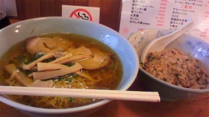 勝の家『らーめん・半チャーハン』850円10月10日(月)山形村何回か伺うも、駐車場に空きがなく、ようやくの訪問です。11時30分に、1番の訪問です(*^。^*)見えづらいですが、脂がしっかり膜を張っています。一口で、熱かったです(^^ゞ家庭的で美味しい味でした(*^。^*)今年、87杯目。