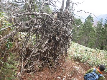 『奇怪な樹』鉢盛山を登る時には、誰も気づきませんでした。下山時に、変な樹があることに気付きました(^^ゞ登りはきつくて、みんな下を向いていたんですね・・これは確かに樹ですが、根っこです。大木が倒れて、根が出てきたんです。樹が2本でした。新たに倒れた樹もありました。樹の肌が、生々しいです。現在、昔の登山口には車で行けず、仮の登山道で約1時間かけ、従来の登山道に合流します。⇒行き で仮設の登山道で登山し、?帰りで、従来車がいける道で下山しました。はっきり言って、御嶽山よりきつかったです(>_