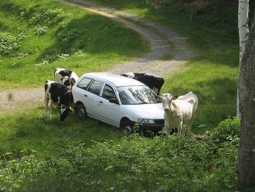 今日も、お仕事は山の中(*^。^*)志賀高原の山の中にある牧場ですが、山の上から戻ってきたら、囲まれていました(^^ゞ白と黒で、仲間と思われた?