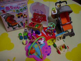 クリスマスイブおまけ・・・自分で自分にプレゼントA^-^;ベビー用品の食玩を先日見つけて以来、、ベビーカーの食玩が欲しくてたまらなかった(><)そして・・・結局今日自分で大人買いA^-^;大人買いといっても・・・4個しか残ってなかったのだけど・・・運良く、2箱目でお目当てのベビーカーはゲット♪あと、こちらのオバチャマから手作りキャラメル戴いちゃった♪無添加の手作りキャラメルは口どけ優しく美味美味の美ー味ーでございました♪感謝感謝♪何処に行っても、ちびオニはお菓子で餌付けされちゃってる現状A^-^;