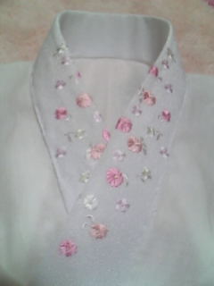 半襟… めんどくさいのが嫌なちびオニは半襟を使わないと言いたいところだけど… 襦袢を長く使い続ける為には 半襟は必需品。 だから、半襟は自分では『両面テープで貼って』着る けど…今日は実家だからf^_^; ママ上様に、ちゃんと縫い付けて貰う いやぁ~゜ちゃんと縫い付けられてると着やすいなり♪ でも五月蝿い年寄り様との席だから 衿は詰めて着るから… 半襟はちょびっとしか見えないんだなぁ… せっかくの可愛い刺繍半襟なのにもったいない…