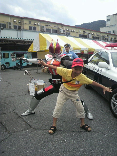 パトカー、白バイ、福祉車両、タクシーなどなどに乗ったり、前に立ったりして、写真を撮って、それをキーホルダーにしてもらったり、子ども縁日(りゅりゅはスーパーボールすくいにチャレンジ!)、さらには、仮面ライダー電王の撮影会があり、楽しみました。