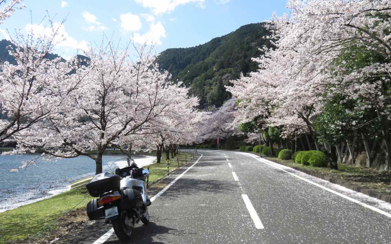 (ときおり吹いてくる強い風に、木々から花びらが舞い散り、さながら雪花のように辺りに舞い降りていきます。水面にはたくさんの花びらがピンクの絨毯のように敷き詰められていました)