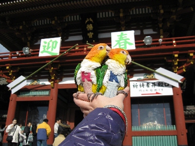 気温は低いながらも良く晴れて、日向はぽかぽかでした。恒例通りインコと人間の健康を祈りました。さて、お守りを入手~。ここで事件が起きました。思い出すのも恐ろしいことです。私の背中に回って行ったリンを引き戻そうとリードを軽く引っ張ると…。リードだけが手の中にありました。リンはそのまま背中にいます。血の気が失せていくのがわかりました。でも、私の手は届きません。ひよたろうが手を差し出すと、思った通り逃げて行きました。逃げた先は崖の下の木のてっぺん…。当のリンはゴキゲンで「リンちゃ~ん♪」とかおしゃべり全開。『リン!お母さんとこにおいで!』と呼びかけるも「リンちゃんおいっ♪」とかゴキゲンでお返事する始末。警備の警察官やら、お参りに来た人やら寄ってくるし~。仕方がないので軽く木をゆすると、隣の木のてっぺんに飛び移りました。最初の木より太さもあり、私が木に登って手を差し出すとすんなり手に乗ってゴキゲンなお顔~。『はぁ~よかった。寿命が3年くらい縮んだ』カイのリードはナスカンはずしが出来るので、私の手作り。少し大きめの金具で作っています。リンには市販のハーネスのリードを使っていました。かしゃかしゃ嘴でいじっているうちに、はずれたようです。鳥用で売っているからと過信するのは危険なことです。今週中にハーネスの改良を試みるつもりです。市販のハーネスをご使用の方も、充分御注意ください。今のところナスカンをダブルにしてみようと思っています。冒険を楽しんだリンはうれしそうにしています。