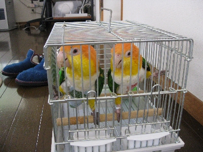 総勢3名のほんとにプチオフ。ひかる☆ちゃん&むぎちゃと桔梗さん&ポコちゃん。黒頭ちゃんたちがお客様です~。お昼ごはんを食べて、放鳥早々にリンがポコちゃんと対戦モード!「黒頭なんて許せないわっ!」即刻タオルをリングに投げ入れて、リンちゃん退場~~~。難しい年頃ですからね…。3歳を超える頃には少し穏やかになっているかな?後は小競り合い程度で半日楽しく過ごせました。(リンちゃんは退場のままだけど)むぎちゃは相変わらずかわいい声でおしゃべり。基本は平和主義なんだろうな~。「これ以上近寄らないでくれたまえ!」みたいな感じ(笑)ポコちゃんはまだまだお子ちゃまなので~黒頭の兄ちゃんと、オレンジ頭のにいちゃんの後をひたすら着いて歩く。「来ないで!」って言われても全然懲りない。ただただ鳥の話だけで大の大人が何時間も~(爆)とっても楽しかったです。また遊びに来てねっ♪