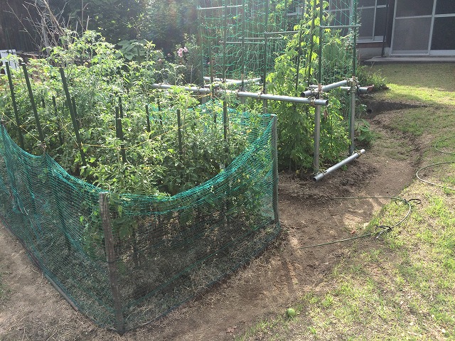 「トマトにビニールの屋根を作ろうか?」「そうね」雨が降るとトマトがひび割れてしまうんです。去年と同じようにアーチを作りました。「とりあえず4本作ったけど」「チョット高過ぎじゃないの?」「高過ぎる?」「去年と同じ高さでいいよ」「・・・・・」40分くらいかかって作ったのに。直棒とアーチを組み合わせて作ったんだけどね。アサ紐でしっかり巻きつけたので指が痛い。「この高いアーチは他に使えないの?」「他に使うところはないよ」仕方がないので全部ほどいて元に戻しました。やり直しの意欲が失せたので草刈りに変更。(笑)なにごとも確認しながらが必要ですね。