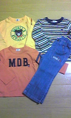 息子のためにダブルBの2009新春福袋を楽天市場のポッキーベアさんで購入しました。90サイズです。2万円と悩んだのですが、ちょっと2万円を出すのはきつすぎるので1万円を購入。それにしても、すごい短時間で売り切れだったので、びっくり。皆さん結構買うんですね。中身です。それぞれの値段を控え忘れましたが、総額26,670円です。左上はトレーナー。右上ボーダー(黄青白黒色)と左下はTシャツ。ダブルB君がちっちゃいワンポイント。パンツはダブルBと書いてるけどダブルB君は居りません。。思いっきり大きいダブルB君がついたやつは一着だけでした。大きいダブルB君が欲しかったので、ちょっと残念。総額的にはすごいですが、でも何だか悲しいわ~。ちなみに、一着だけ日本製であとは中国とベトナム製でした。