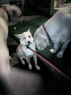 うちのワンコも宿の大きい看板犬たちに囲まれて