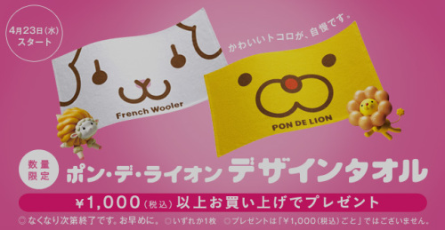 ミスドのクロワッサンドーナツが食べてみたかったのですが…1個194円(税込)ってちょっと高いから躊躇してたんですが、1000円以上買うと本でライオンのバスタオルがもらえるってことで、買ってみました。後、新商品のワッフも!1個プレゼント券でクランツリングも!1050円購入して、バスタオルゲット!薄手ですが、もらえるだけいいかな。クロワッサンドーナッツは、甘いのが苦手な私と上にとっては、微妙ワッフは、シンプルな感じがいいのでまた買ってもいいかな?