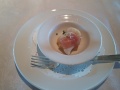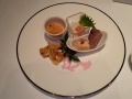 塔の上のラプンツェルをイメージしたメニュー プレ・アペタイザーマッシュルームクリームを添えたクラブケーキザクロと赤ワイン風味のソースマスカルポーネチーズの香るリゾットミックスシーフードとビスクソースと共にレモンマリネしたタイのアッローストミント風味のズッキーニのインサラータ または スモークソルトの香るポークテンダーロインのアッローストローズマリーとシトラス風味のポレンタを添えてチョコレートジャンドゥージャムースマンダリンシャーベットと共にコーヒーまたは紅茶 肉料理を選びました。