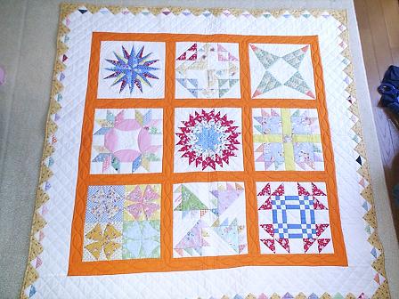 おはよう♪みちくまです。昨日、ブログを復活したら、コメント、ご来場ありがとうございます。元気をいっぱいいっぱい頂きました。ブログを閉鎖をしようと思っていただけに、やはり、嬉しいものです。昨日は、小熊とショッピングセンターに行き、その後お義母さん宅へ。敬老の日のお祝いに・・・。お花と、バイト先で売っているエプロンと舟和の芋ようかんセットを。喜んでいただけましたぁー。小熊もお義母さん、お義父さんとは久々。今年の夏休みはあまり会えなかったからね。って我が家から、数十分の距離ですが・・・。小熊は塾、私は仕事でばたばたでしたからね。そして、甥っ子も。あららららー。この間、あったときは髭なんか生えてなかったぞ。ってこの間は2月にあったんだよねぇ。受験でお義母さん宅に泊まっていたの。その頃は、関西に住んでいて、今は家族で東京に住んでいます。また、引っ越すそうですが・・・。大学生になり、ずいぶんと雰囲気も変わりました。でも、相変わらずいい子です。帰るときも、わざわざ外まで見送ってくれちゃいましたからね。小熊も、「ああー言う彼氏いいなぁ?」だってー。小熊とは、5歳違いますからねぇ。ハッハッハッ。あっ、そして、今朝、デジカメのインストールをしました。がー、うーん、画像アップをしようと思ったら・・撮り忘れ・・・。だもので、今までのデジカメで写したのがあったので、それを載せます。↓パッチ学校、高等科サンプラーキルトずいぶんとシンプルになっちゃいました。本当は、周りの白の格子のキルトを変えたかったの。もっと凝った物にしようと思っていました。がー、やはり時間がなく、研究科に進むのはよそうと思っていたので・・というか、やりたい事がまだあったので・・・とゆっくりしたい・・と。シンプルシンプルで。ホー。肩がバリバリになるとまた歩行不能というか気持ち悪くなるので、早めにマッサージに。てもみんで上半身のマッサージを受け、これが気持ちよかった。本当にそこまでしてくれるの?という感じ。今月、時間があれば、全身をやってもらおうと。高いですが、やはり凝りを取らないとまたまっすぐ歩けなくなっては・・・と。針が持てない日々、持ちたくない日々が続き、自分ながらよく頑張りました。くじけここまでやったのにやめてしまおうと思ったこともあり、3箱ぐらい布をしまい、本も古本屋さんに売ったり・・・。パッチワークというものを封印しちゃおうと思っていたの。これがあるから・・・苦しいんだぁーって。なかなか本も読めなかったので、いろんな本を読み、気持ちを変えまたキルトと向き合えることに。今は、今自分が作りたいものを思案中です。ノートに書きとめ、形にしていこうと思います。今日は、小熊と学校説明会の為お出かけです。秋は、説明会続き、文化祭続き・・・疲れちゃいます。がー、慎重に選びたいからね。今日も、1つでいいから良い事がありますように・・・。いや、1つでもいいから、良い事しよう。
