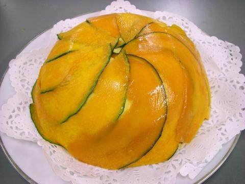 長浦のパティシェリー『○しがき』のカボチャのムースケーキです。スポンジケーキに挟まれたカボチャのムースは、程よくラム酒の香りがカボチャの味を引き立てて、品の良いあっさりとした甘さと生クリームのまろやかさがとても美味しいケーキでした。まわりに貼付けてある、カボチャスライスのシロップ漬けも美味。なので、ハァ…ダイエッターなのに2切れも食べちゃったよ…ここのケーキは、実は非売品です。なぜなら、長浦のパティシェ○しがき氏が気が向いたときだけ作ってくれて、食べることができるケーキだから。大変ごちそうさまでした。また、よろしくね♪ ○しがきさん♪♪
