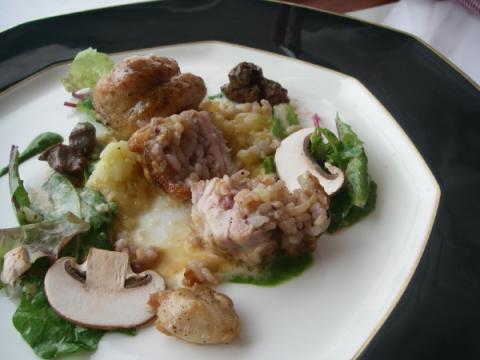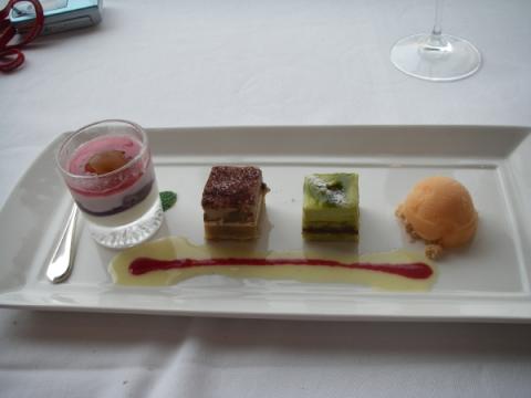 昨日の続きは、メイン2種とデザートの盛り合わせ。まずは『富士山麗で健やかに育った若鶏に、発芽十六穀米を詰め込んだポーピエット風を、3種のソースのテイストで』。鶏の脂の旨味が詰め物にしみこんで美味。こちらは美味しい脂と甘味で旨さを出した『熊本産黒毛牛テールのやわらか煮とフォアグラをほっくほく!のキタアカリでスフレ仕立てに』ただし、キタアカリのマッシュは思ったより軟らかくて、ちょっと思った感じと違うイメージ。「ほっくほく」はもうちょっと粉質な感じでは?デザートの盛り合わせは4種。『当ホテル自慢のパティシェが作るオリジナルケーキを お試しサイズで、3種日替わりジェラートを添えて』。しあわせ!!。左から、ブドウのムース、クリのモンブラン、ピスターシュ・ショコラ、夕張メロンのソルベ。クリのモンブランは、マロングラッセがたっぷりで香り高く、甘味まろやか。ピスターシュ・ショコラは濃いピスタシオのクリームがまろやかでトロけます。夕張メロンのソルベは中にクランチが隠れていて、カリカリっと楽しい歯応え。本当に、ここのホテルのケーキは凄い!!IIFEXでのお仕事はちょっと大変でしたが、美味しいランチを食べるとたちまち元気になってしまうのが私の良いところ♪