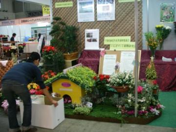 1週間ぶりの書き込みです。本当は盛りだくさんだった視察のことも書きたかったんですが、忙しくて…。さて、明日から3日間幕張メッセを会場に、IFEXが開催されます。そこで本日は、F女史や下爺さん達と一緒に千葉県の鉢花ブースの制作作業です。写真は、作業中の下爺さん。作成ブースは、千葉県鉢花生産者連絡協議会とマット植物研究会の合同なので、基礎のグリーンはマット研究会の『タイム 他』。その上に、シクラメン部会やベゴニア部会の花を飾り、K氏のハツユキソウや下爺さんのアイビーで引き締めてみました。白っぽい植物は『木白香』です。で、今は家で明日に使うパンフの作成なんかをしているわけですが…。明日(20日)はメッセ近くのホテルマンハッタンを会場に、『花のささやき』が行われます。