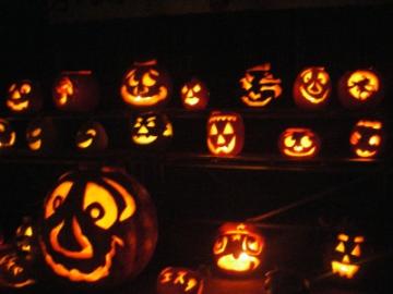 参加者の汗と血と涙の結晶(笑)のかぼちゃランタンは、こんなにたくさん。品種はアトランティックジャイアントやハロウィーンなど数種あり、人によっては硬い品種にぶちあたって苦労したとか。私のお気に入りは、『ぼのぼの』に出て来るクズリくんみたいなやつ。シンプルながらいい味出してて、楽しそー♪凝った人もいて、このドクロやドラキュラは時間がかかったでしょうねぇ…。かぼちゃを『かぼちゃ頭のお化け』としてとらえないで、『提灯』としてとらえるのはすごく日本人ぽい視点ですね♪