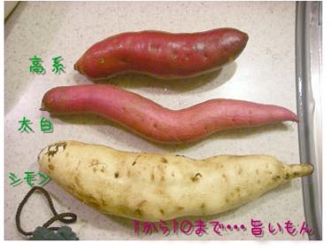 本日のサツマイモの食べ比べ、品種は上から 高系14号、太白、シモン。蒸かしてから断面を見ると、太白は真っ白。シモンも白。いかにもサツマイモらしいのは高系14号。そして蒸かしイモが熱いうちは太白もシモンも粘性。人によってはベチャベチャっていうかもしれない。でも不思議と太白は冷めると硬さが戻って来るので食感は 高系14号>太白>シモン。イモの甘さは太白が優れているので 太白≧高系14号>シモン。でもサツマイモらしい甘味の質と香りも考慮すると 高系14号>太白>シモン。…高系14号はやっぱり美味しいですね。