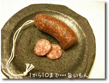 市原 タンネンバウム西野 の『乳酸発酵サラミ』本日の旨いもんです。タンネンバウム西野は生ソーセージのファンが多いようですが、今年初めて購入した『乳酸発酵サラミ』、目から鱗の美味しさでした。『乳酸発酵させてる最中ですから、お家の中の涼しいところに下げて熟成させて食べてねぇ』暮れと正月我が家を訪れた人は、『玄関に何がぶら下がってるんだろう…??』って思ったでしょうね。家の中の涼しいところ…玄関しかなかったので、玄関に下げて2週間、毎日熟成が進んでいく香しい香りが我慢できなくて…ついにナイフを入れてしまいました。 ウッ…旨い!乳酸発酵のおかげで香りがよく、旨味がじわっと染みでるスライスは舌の上で美味しい脂がツルッと溶けて…サラミの硬さが口の中ですぐにほどけてしまう、なんとも贅沢な味でした。