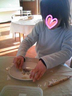 自分達でするのは、好きなシールを選んで、水にシールをつけてシール部分のみをお皿に貼るの。