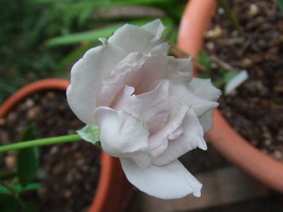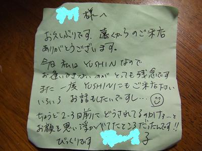 25日金曜日、朝9時にしたのに、うまくその日15時からの予約が出来て美容院へ、ンヶ月ぶりに行って来た。かなり髪が伸び、量も多くなっていた。特に量が問題。かなり量を減らしてもらった。その時、担当してくれたスタイリストさんからメモをもらった。美容師さんからのラブレター。(ポケットに入れていたのでシワになってしまった!ゴメンナサイ!)25日に担当してくれたスタイリストさんの前の担当で、この美容院の先生。ただ、二店舗目を近くに出し、平日はそちらへ行っているのでこの日は会えなかった。そしたら、予約状況を見ていてくれたのか、ラブレターを下さった嬉しい私が名古屋駅の近くのマンションに住んでいた時にオープンして以来、カットはずっとそこを利用していた。今はちょっと遠くに引っ越してしまってなかなか行けなくなってしまったのだけど、やはり自分の癖を良く知っているスタイリストさんに切ってもらうのが一番。その上、こんなラブレターまでもらったら、他の方にもお薦めしたくなってしまう。サロン・ド・パンhttp://www.e1-pan.com/index.html二店舗目のYUSHINはアーユルベーダを取り入れたヘッドスパ・マッサージも、カットなどもしてくれる。(上記アドレスにYUSHINの情報もあり。)今度はYUSHINの方へ行ってカットしてもらおうかな? 暑くなってきて、最近開いたバラの花も姿が乱れたので切ってしまった。もう、花がない、淋しいなぁ、と思っていたら、なんの、私が気づかなかっただけ、まだ咲いてくれている子がいた26日朝のモナリザ。蕾だった方がかなり開いた。右後ろに先に開いた花もかろうじて綺麗な姿を留めていてくれている。気づかなかったホワイトクリスマス。もう、先の花で終わりだと思っていたら、もう一輪あった! なんか、掘り出し物見つけたみたいで嬉しいミスティーパープル。小さな小さな蕾。ピント合わず。でも、咲いていてくれるだけで嬉しい。よ~く見ると、HT系のバラにもまだ小さな蕾がいくつか。これを咲かせるかどうか、迷うところ。つるバラも枝がかなり伸びてきて、蕾もちらほら。思ったより小さな花なんだけど。ウェルカムフラワーとして客間たたきの入り口付近に置いたブルーサルビアと三色のミリオンベルの鉢、サルビアの勢力が強く、ミリオンベルはわずかに咲いているだけ。でも、最近、ミリオンベルに勢いが付いてきたので、こんもりとしたミリオンベルの鉢が見られるのも時間の問題かも。