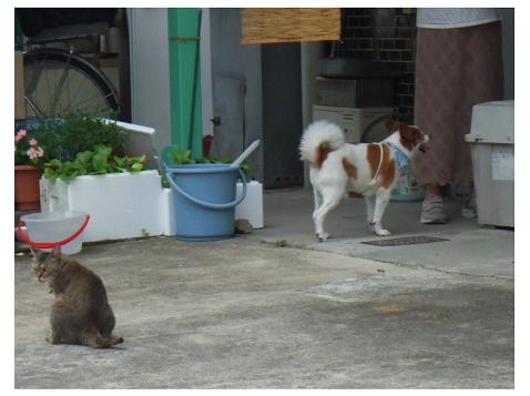 25日、出かける予定があったので、朝、いつもより早く起きてゴミ出し。そしたら、道中、ワンちゃんとニャンちゃんが一緒に散歩しているのに遭遇。4月だったか、5月だったか、早朝からの通訳での通勤途中に出会った子たちに再会したのだ。写真は右端に写っている飼い主さんについて、まずは、ワンちゃんが家に入ろうとしているところ。ニャンちゃんは少し離れている。飼い主さんが呼ぶと、ニャンちゃんも家に入ろうとして、ワンちゃんのそばへ。他人がいるとなかなか近寄ってくれなかった二匹だけど、家に入ろうとする時になってやっと近づいてくれた。そしてなんと、その御近所さんで、ニャンちゃんの方のきょうだいだというニャンちゃんにも。まあ、早起きしたらニャン×二匹、ワン×一匹、しかもワンニャンは一緒にお散歩の風景に出会えた。早起きは三ニャンの徳。え? ニャンが一匹足りないって? それは私(相方には「ねこ」と呼ばれている)です。そして更に徳が。。。。24日、こちらから電話して不在だった裁判所の担当の方がをかけてきてくれた。電話代、ラッキー支払督促郵便で裁判所から債務者へ送ったけど、郵便の留置期間を過ぎて戻って来ていた。それへの対策方法を教えてくれた。再送達上申書というのを書いて、再度、裁判所から郵便で送ってもらうんだって。それでも戻ってきたら、また、別の手段を考えるとのこと。ただ、債務者がその住所地に住んでいることの確認(電気や水道のメーターが回っているなど)が取れれば、送付したことにして次の手続きに進めるらしい。どなたか、京都府伏見区豊後町の近くにお住まいの方で、見に行ってもいい、という奇特な方がいらしたら、メッセージください。別途、詳細な住所お知らせします。それを証拠に、払ってもらっていない通訳代金の差し押さえに入ります。できたら、メーターが回っているところを、ケータイかデジカメ、ビデオで録画して送っていただけると証拠になりやすいんだけど。私は住所地が京都からだいぶ遠いので、もし、ご協力いただける方がいらしたら、ぜひお願いしますそして徳は更に続く。今月の生活費負担分を出して、とくまさんに迫られていたのだが、あまりの髪の乱れ様に、旅行に行く8/2までに美容院に行って来い! その分、支払から免除してやる!とのお言葉が。ありがたや~ 喜んで美容院行ってきました。で、25日、朝一で裁判所からがかかってきた後、美容院に電話したら、なんと25日の正午過ぎの予定の後、ぴったりの時間に予約が取れた!ガソリン代の高い昨今、市街地に車で出かける25日に、ついでにでいきつけの美容院にいけたらラッキー!と思っていたら、ホントに行けることになった。泣きっ面に蜂、踏んだり蹴ったりの日が続いていたけど、神様は見放していなかった! 25日のお花デモルフォセカの花、以前、花が全部終わったので切り戻したんだけど、復活して今日、花を見せてくれた。ベランダで育ったアスター、ちょっと背が高くなりすぎたので、少し切って、ト音記号の形の一輪挿しと低い花器に活けた。場所は台所。少し風景が明るくなった。しばらく、ここの花、切らしていたので。いい日が続くといいな。