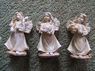 6日、7日に100円ショップで大人買い(?)したオーナメント、他にもある。昨日の日記には二体しか写っていない女の子の天使、他の100円ショップに行ったらもう一体、デザイン違いがあった。実は三姉妹だったのだ!今、溢れるように咲く花がないので淋しいけど、鉢に置いてみた。HCではこんな可愛い、星型のサボテンをゲット!とっても小さいの。。。昨日飾りをつけたミニバードゲージに入れてみた。なかなかいい感じ。これもHCで買った苗。カルーナというらしい。四色売っていたけど、とりあえず三色購入。カルーナは玄関のハンギングに植え付け。そして新しいぶら下がり猫のオーナメントをつけた。もと、ここにぶら下がっていた猫は、ベランダのトレニアのハンギングに移動。赤矢印の先が、もと玄関にぶら下がっていた猫。そして青矢印の先のチワワビックは昨日、HCでゲット。今日は、ベランダのオーナメントたちをご紹介。シュガーバインの鉢にいる天使。実は、羽根、両方とも折ってしまった子。。。バラの根元にいる天使。デザイン違い。別のバラの根元には、猫の親子が。デザイン違いの猫の親子がラベンダーの鉢に。バラは雨でかなり花びらが落ちてしまっていて、咲いているのを探すほうが一苦労。かろうじて二輪。ベランダガーデンのグラハムトーマス、ひっそり開花。一階たたきのカブキも開花。つぼみの時はもっと濃い黄色だったけど開花したら少し淡い色になった。他のバラも頑張れ~!オーナメントたちも応援しているぞ~。最後に忘れていました。毛糸玉に乗った猫のオーナメント、ちょっと元気ないんだけど、階段に置いてあるプミラの側に配置しました。うちにはいったい、何匹猫がいるんだろう?