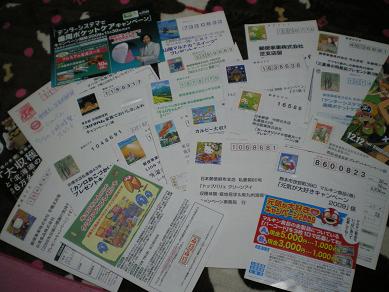 今週何にも届いてません・・・。今日もハガキ24枚投函しました。で、今月95枚~。今から、少し書けるかな今月から、幼稚園のママ友1人に懸賞の楽しさを教えてあげて、一緒にハガキを探しに行ったりしてます~。オソロ当選ができたら、もっと楽しいんだろうな~。さて、旦那が帰ってくる間に何枚書けるかしら??そう言えばコカコーラのクーのトースターのあて先が分からないんだけど、誰か詳細教えてくれませんか??HPから何故かファイルが開けないの・・・。