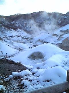 さて!二日目のことを書こうと思います(*´∇`*)この日は、朝8時過ぎに宿を出て、近くにある、地獄谷に行ってきました♪北海道遺産でもある地獄谷。登別温泉の最大の源泉といわれる地獄谷。大地獄を中心に15の地獄があるそうで、そこから、毎分3000リットルの温泉が湧き出ているそうです。写真では、雪と蒸気が同じ色でわかりづらいですが、色んなところから、いっぱいの蒸気が出てました(*´∇`*)地獄谷を見学した後、次は昭和新山へ。雪景色で、キレイだった~~(*´∇`*)目の前に見えると、400メートルちょっとの山でも迫力がありました(・∀・)近くにはクマ牧場もあったけど、そこには行きませんでしたヾ(≧▽≦)ノギャハハ☆クマは冬眠の季節なんでね♪そして、次は洞爺湖。ちょっと楽しみにしておりました(*´∇`*)しゅうい43キロの洞爺湖。すごく大きかった~♪湖の真ん中に中島があり、写真を見てもらうと、わかると思うけど、何個かボコボコしてますよね?すべての山に名前が付いてるんだけど、なんて名前か忘れちゃった( ̄▽ ̄;)!!ガーン洞爺湖の周りは、もちろん雪!膝までズボっと入っちゃうぐらい深くて、童心に返り、遊びまくってました (´▽`*)モハァァァ♪洞爺湖を後にしてからは、長万部へ。そこで、お昼ご飯の海鮮バーベキューを食らう!まぁまぁ、美味しかったです♪そのご飯食べたところの近くで、コレ発見!メロンです!イヒヒヒヒー♪ヾ(≧▽≦)ノ彡☆ばんばん!!でっかいのコレ!ちぃの身長より、でかかったぁ~♪記念に撮っちゃいました(▼∀▼)ニヤリッお昼ごはんを食べて、大沼公園へ、向かいました。大沼公園は、大沼と小沼とじゅんさい沼いう湖があります。白鳥が来ることでも、有名みたいで、ちぃたちがいったときも、ちょうど白鳥さんがきてましたが。。。車だったので、そのまま通過(゚∀゚)アヒャ!!そのあとは、五稜郭へ。あの辺りは、新撰組の土方歳三さんが、有名みたいですね。銅像や、資料館なんかもありました。で、五稜郭が見えると言うタワーを、友達が発見。。。ちぃは高いところ嫌い。。。なのに、友達2人に両手を取られ、強制連行:ヽ(゜▽゜ )-C