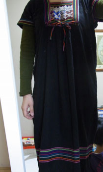 来ましたよ~私にとっては高額な春コート。冬のカシミアやアンゴラのコートで1万以上3万とかの物を購入するのはわかるけど春コートで1万6千円。しかも定番の物ではなくモン族物というコーデが限られたコート。そりゃもう・・悩んだ末の購入でした。そういえば・・一昨年買ったアンゴラのコート4万で買ったのに今季着なかったな・・。10年前に買ったカシミアのコート8万はワンシーズン着たまま実家のクローゼットで眠ってる・・・。こういう4万とか5万以上のコートって皆さん数年したら処分するんでしょうか?それとも一生物としてワンシーズン数回着ながら大切に保管するんでしょうか?教えて欲しいです~。さて、到着したモン族ワンピとコートモン族のとっても可愛いワンピース!モン族ワンピースA02 7900円色合いも春っぽく可愛いんですが残念ながら前身ごろの目立つ部分に1センチぐらいのシミと1か所糸が飛び出ているホツレが・・昨日のモン族パンツと違って隙間がある刺繍です。 157センチの身長でひざ下5センチぐらいです。モン族の布とジョムトンの組み合わせがステキ!モン族&ジョムトンコート(7分袖・裏地なし) 驚きの15800円古布の風合いもいい味が。ジョムトンの色味も綺麗です。この古布刺繍にやられた!可愛い! 胸下から広がるAライン七分袖です。ワンピの上に重ねてみましたが、細身のカットソー1枚とボトムも細身のゴアパンとかの方が綺麗。お気に入りの大切な1着になりそうです。オマケに小物入れ付いてました。にほんブログ村