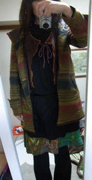 マーライさんのスカート、けっこう派手目なのでチラ見ぐらいで着てみました。既に売り切れ物ばかりですが・・外出時はアウター羽織って。POKHARAのチュニックワンピは丈が長くスカートが隠れ過ぎてしまうので、紐を腰の部分ではなくウエストで絞りました。それだけだとウエスト部分が少しもたついてしまう為、変形ベストを羽織ってみました。インナーに黒のタートルは失敗だったぁ・・ちなみにこのベストはバックがスカートのパッチワーク部分と似た感じのカーキ。アウター脱がないんだったらベスト羽織らなくても茶系のアウターで合う感じもする。やっぱりこのワンピは優秀です。紐でスカートの丈も調節できるし袖口広めの七分も可愛い。 使用品は↓こちら 1990円1000円3999円 にほんブログ村
