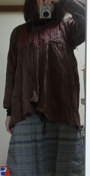 いつも買う気で行くわけじゃないのに。行くとどうしても買わなくちゃいけない気になるのは何故?衝動買いの産物がこちら薄手のチュニック。でもかなり薄くて透ける・・。とっても安かったの。柄がペイズリーなら良かったのに。これの赤系がかなり民族チックで素敵でした。でも年齢的な事(裾がフリル)を考えて無難にオレンジとブラウンにしちゃいました。安いから赤も買っておこうかな。。大人っぽいというか渋い柄と試着したらラインが綺麗だったので思わず・・・。これは試着したので衝動買いではないんですがお値段少し高めなのに買っちゃいました。ラオス布のストール。これはもうヒトメボレ。色がこちらも赤系と私が買った黒系と2種類あって悩みに悩んで黒系を買いました。頭に巻くつもりで買ったんですけど、布に張りがあるのでかなり巻きにくいのと、この巻き方好きなんだけどこの状態だとせっかくの刺繍部分が隠れてしまう。お値段半額でした!私、やはり明るい色の物を頭に巻くよりも、こういう渋い系の方が似合う事に気付きました。昨日の白にパープルのタイダイストールを巻くのは似合わない今日はカシミール刺繍のワンピでお出かけ。でも昼間はすごく晴れて天気が良かったのに、数分後には強風と吹雪でビックリしました。このワンピかなりお勧めです♪にほんブログ村