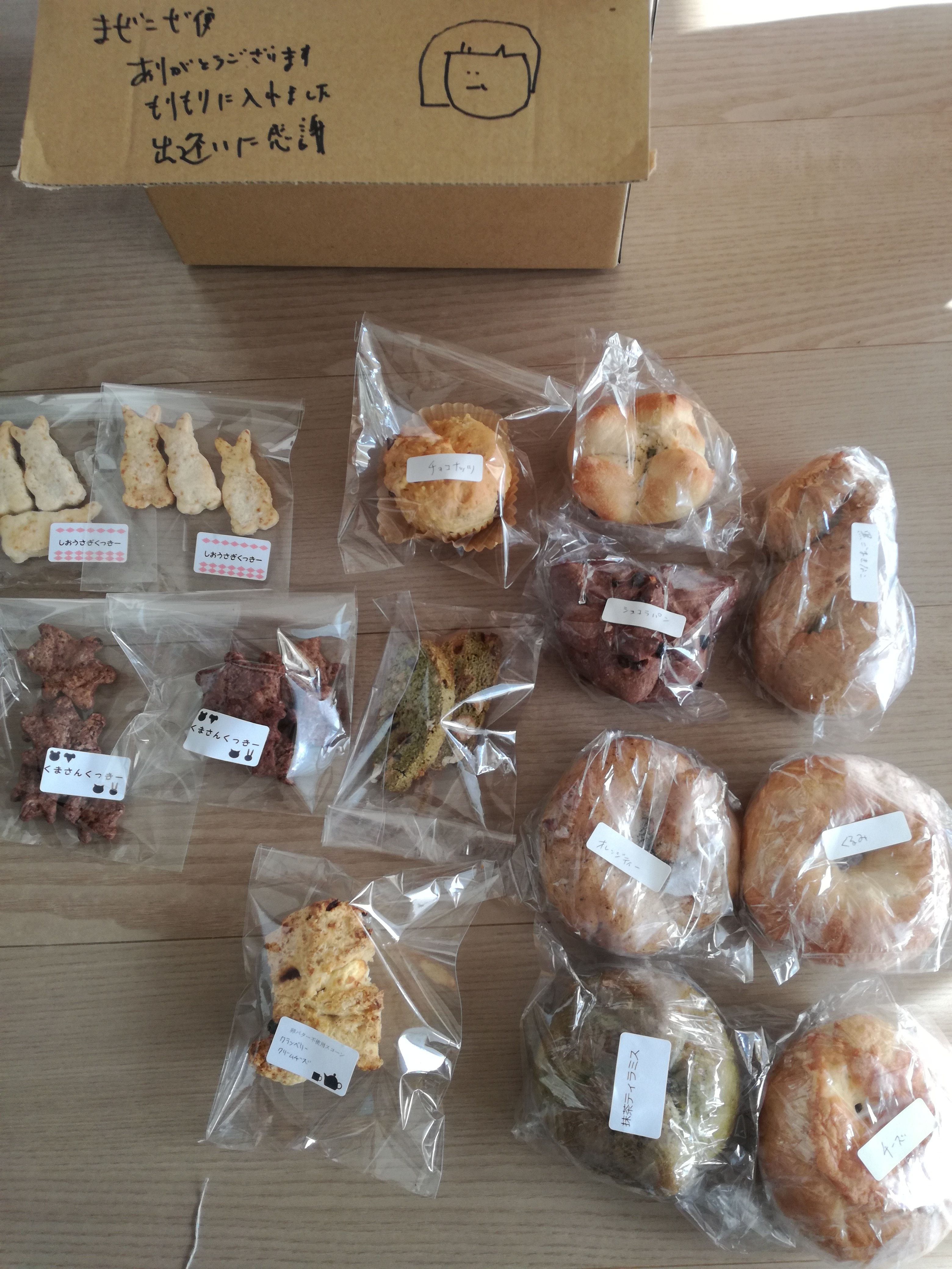 去年の7月にお取り寄せした福岡のパン屋まるさんを2度目のお取り寄せその前にも一回お願いしたんだけど、あちらの都合でキャンセルされてしまって久々になりました~。連絡なしのキャンセルは驚きましたけど(インスタでの告知のみ)、子育てをしながらとても苦労してギリギリの状態で安心安全なパンを作っていらっしゃるのでしょうがないんです。おひとりで頑張っていらっしゃるから、便利な世の中で増えた出来る限りなんでもやってくれるお店ではないのでその辺を含めて理解できなければおススメ出来ないお店です。今回はまぜこぜ便(3000円+送料)オレンジティーベーグル、くるみベーグル、まっちゃティラミスベーグル、チーズベーグル、ショコラパン、黒ごまきなこ、チョコナッツ、クランベリークリームチーズスコーン、くまさんクッキー×2、しおうさぎクッキー×2、ビスコッティ、塩バターの14個入りかな。大きさは小さめだけどいっぱい入っていて嬉し(ここのパンはどれも子供でも食べやすいようにと小さく作られています。)こちらのおやつは卵、バター、マーガリン、白砂糖、生クリーム、牛乳など怪しいものは入っておらず、甘味に使われている甜菜糖も控えめなので安心して食べられます。もう授乳も終わったから食べてもいいんだけどね。離乳食が進んできた息子に黒ごまきなこを水でふやかしてちょろっと分けてあげると喜びました。ベーグル系は好みとは違うけど、どれも素朴な美味しさがありました。クッキーカリカリで美味しかったな。今度は赤ちゃん便を注文したいな。ごちそうさまでした。国産小麦のパンとおやつの店まる(2018年に大分県国東市安岐町に移転)福岡県豊前市八屋1427-3https://www.instagram.com/panda.1231.ppp/