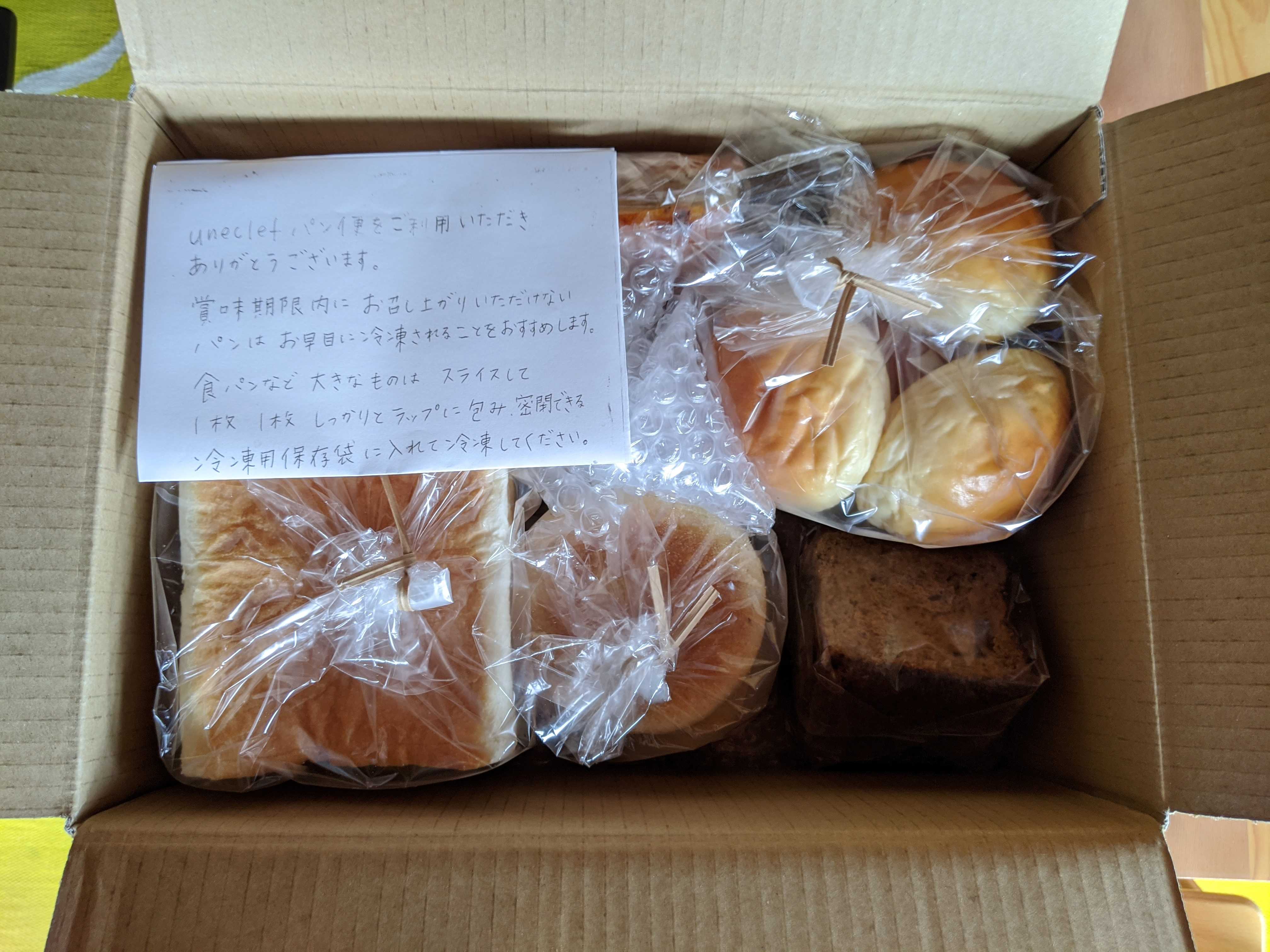 お菓子セットもシナモンロール、カルダモンロールも美味しかったユヌクレさん。3度目のお取り寄せはuneclefのパンset1分以内には売り切れていた前ほど激戦ではないみたいで、余裕をもってクリックすることが出来ました7月31日に注文したものが、今日届きました。uneclefのパンset(3293円+クール便送料)ユヌカレ、プティリッシュ×4個、レモンとセイジ、フォカッチャドライトマト、イングリッシュマフィン×2個、スパイスとホワイトチョコとラムレーズン、カンパーニュショコラ、パイナップルとプルーン、チェリーと晩柑の9種類13個が入っていました。通販のパンだと原材料表示がないものが結構ありますが、ここはしっかりとしていてその点も安心2歳の子供にも分けやすいです写真をとってすぐに冷凍庫に入れて、みんな常温解凍していただきました。ユヌカレ(食パン)常温解凍→スライス&リベイクしていただきました。表面カリっと中はふわもち、優しい味。少しヒキがあるけど、噛みちぎりやすいし、香ばしさと良い甘味があって、シンプルに美味しいです硬いパンが好きで食パンをあまり好まないうちの2歳児も良く食べました。主人は最近のお取り寄せで舌が肥えてしまったのか「普通に美味しいけど、こないだ食べたとこ(たぶんComme'Nさんとルシュクレクールさん)のが俺は好き」と。確かに小麦の味の強さや芳ばしさがコムンさんやルシュクレクールさんの食パンが強くて印象的だったなぁ。だけど、ユヌクレさんの食パンのじんわりした甘味も捨てがたい…っていうかやっぱり美味しい。チェリーと晩柑これも常温解凍→スライス&リベイクしていただきました。パリッと噛むと、中はしっとりずっしり詰まった生地。写真の通り、チェリーと晩柑ピールが一杯必然的にめちゃくちゃジューシーで口いっぱいに甘酸っぱさが広がって、晩柑の爽やかな苦味酸味にライ麦の癖のある酸味も加わってめっちゃ美味し~これも好きだわパイナップルとプルーンこちらも表面がパリッと小気味良く、中はしっとりずっしりだけどきめ細かく。やっぱり果物が一杯。見た目にはプルーンが多いなと思ったけどパイナップルが大きくて存在感抜群生地自体の酸味にプルーンとパイナップルの甘味優位の甘酸っぱさ…いろいろ味わえるけど喧嘩していなくって美味しいスパイスとホワイトチョコとラムレーズンこれも常温解凍→スライス&リベイクしていただきました。食べる前からシナモンぷんぷん。ふわふわしっとりでケーキみたい。食べると、カルダモンとかのスパイスがめっちゃ効いていて、ホワイトチョコの組み合わせ美味しい我が家ではこういう変わったパンを食べるのは私だけだから、一杯食べられて嬉しいそれでも足りないくらい。大好き過ぎて10個くらい食べたいwwwレモンとセイジこれも常温解凍→スライス&リベイクしていただきました。食パンの生地にめっちゃレモンピールとセージ。レモンとセージのそれぞれの特徴的な香りがプンプンして面白い感じだけど美味し。両方とも爽やか系だから合うのかな。レモンの爽やかな甘味と酸味、セージのちょっと癖のあるほろ苦さ…夏らしい爽やかな味わいでしたカンパーニュショコラこれも常温解凍→リベイクしていただきました。ダイスアーモンドが入った甘くないココア生地のカンパーニュの真ん中にビターチョコレートの活火山生地に比べると甘く感じるチョコレートがとろけ出て美味しい。ナッツの食感もいいアクセントこれも好きでしたプティリッシュこれも常温解凍→リベイクしていただきました。ほんのり甘くてバターが香るちょっとリッチな感じ。きめ細かく詰まった生地はふわっと軽くて美味しペロリと食べちゃいました。主人と息子にはスクランブルエッグとベーコンを挟んで出したら好評でした。息子は分解して食べていたけどねフォカッチャドライトマトとイングリッシュマフィンは主人と息子が美味しく食べました。ごちそうさまでした。チェリーと晩柑やスパイスとホワイトチョコとラムレーズンあたりがすごく好みでした。こういう果物やスパイスを合わせたパンは主人は好きじゃないからシンプルで美味しいパンも入っていて家族で食べるのに良かったです。ユヌクレ(uneclef)東京都世田谷区松原6丁目43−6 アロンスクエア2023年12月に長野県根羽村に移転されたそうですhttps://www.instagram.com/uneclef/お試しセット【6種類セット】初回限定お一人様1回限り!-パン工房カワ