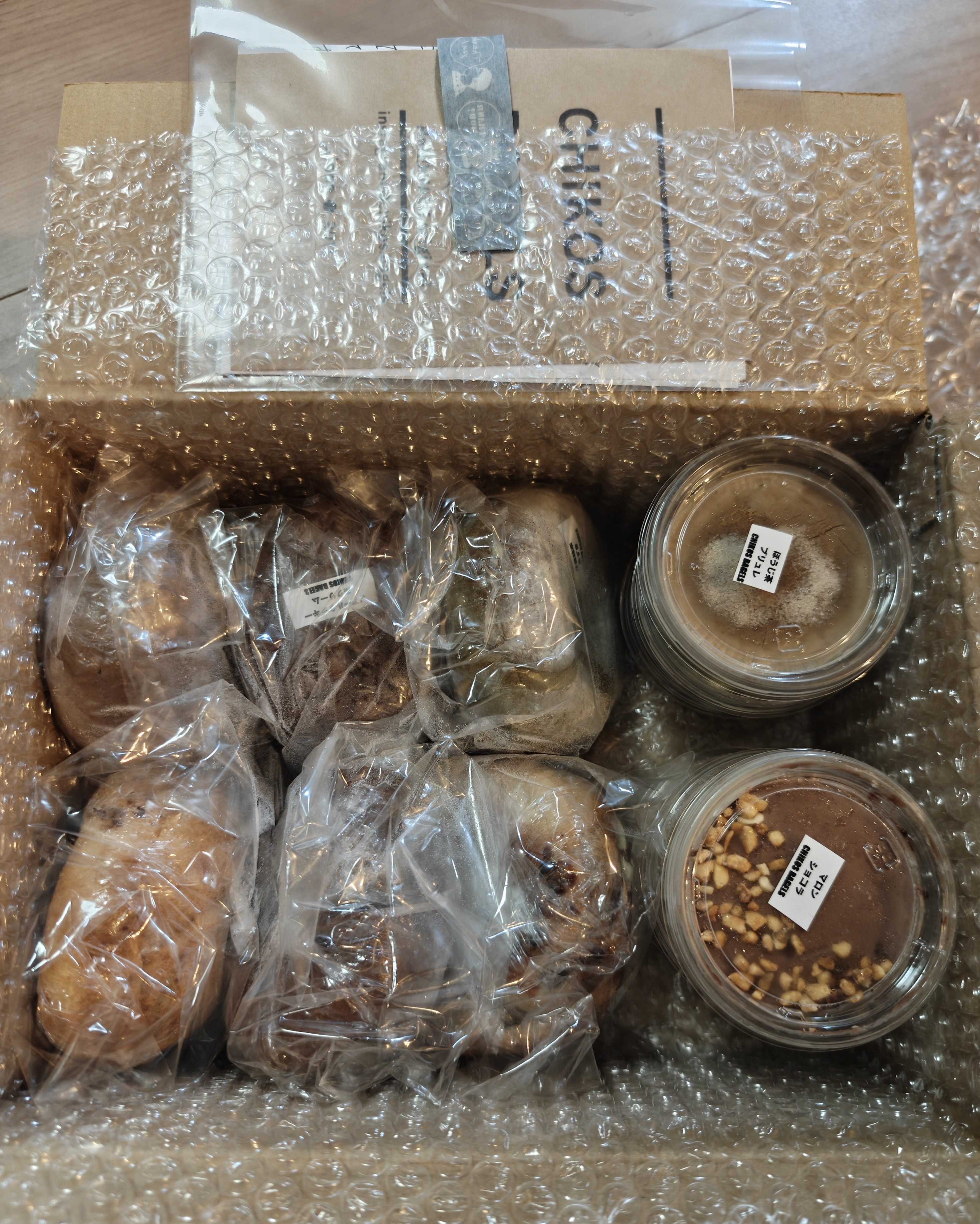 お気に入りの通販専門ベーグル店のチコスベーグル(CHIKOS BAGELS)さん通販のラインナップがとても美味しそうでしたので2月以来久々にお取り寄せしてみました9月3日にあった追加募集に応募して、9月22日に発送されて、24日に千葉で受け取りました最初の募集は応募し忘れたから、再募集があって良かったモダン薫る Take it easyサンドセット(3900円+ヤマト運輸クール冷凍便代1000円)〇マロンショコラ〇浮雲抹茶あずき〇ほうじ茶ブリュレ〇ノアールクッキー&クリーム〇ハニーヨーグルレモンタルト〇黒ごま黒蜜きな粉のすべてサンドの6種類入り黒ごま黒蜜きな粉って食べたことある気がすると思ったら、前に黒ごま黒蜜きな粉餅があったのねあれ美味しかったから楽しみ〇黒ごま黒蜜きな粉ベーグルは自然解凍→リベイクして、フィリングは冷凍庫から出して10分くらい経ったものを挟みましたきなこトッピングできな粉クリームが巻き込まれたプレーン生地はガリッとしてむぎゅっと詰まった噛み応えのある美味しい生地トッピングのきな粉が香ばしく焦げて美味しフィリングはたっぷりの黒胡麻が練りこまれた滑らかなクリチベースクリチに柔らかくモチモチの求肥ときな粉とパイ生地がトッピング冷や冷やのアイス状態のフィリングが滑らかで爽やかで単品で美味しいし、熱々でガリガリ噛むベーグルの香ばしさとぴったりなのよね美味しい和の組み合わせでした〇浮雲抹茶あずきベーグルは自然解凍→水をバシャっとかけてリベイクして、フィリングは冷凍庫から出して10分くらい経ったものを挟みましたバリっとした抹茶生地はほんのり苦味もあるけれどまろやかで、ホワイトチョコレートも巻き込まれているから食べやすくて美味しフィリングは底に求肥が敷いてあってモチモチの中にクリチベースの抹茶クリームが入っている感じスイーツとしてもベーグルとしても満足感高いのに、クリチベースだから爽やかにまとまっていて、大納言の甘味が追加されてこれもめっちゃ美味しい〇ハニーヨーグルレモンタルトベーグルは自然解凍→水をバシャっとかけてリベイクして、フィリングは冷凍庫から出して10分くらい経ったものを挟みましたブルーベリーとホワイトチョコレートが巻き込まれた生地はギュムっと詰まった美味しさ表面にあるバター香るクッキー生地とザラメ、それに生地の中でたまに当たるトロけたホワイトチョコレートが甘くて、フィリングやブルーベリーの酸味にあっていて美味しフィリングはレモンの風味が効いてサッパリした香りとサッパリした味底にクランブルが敷かれていてホロサクっフィリングだけでケーキやアイスとして売っても美味しそう〇ほうじ茶ブリュレベーグルは自然解凍→霧吹きでちょっと水をかけてからリベイクして、フィリングは冷凍庫から出して10分くらい経ったものを挟みました軽い感じのほうじ茶生地はもちっと良い弾力で、キャラメルチョコが巻き込まれていてリベイクでとろけてミルキーな甘味が全体に控えた甘さの中で際立ちますトッピングにはクッキー生地とアーモンドスライスフィリングは滑らかなクリチベースのほうじ茶風味、キャラメルチョコチップが入っていてコリコリって食感と甘味の良いアクセント、表面にはさとうきび糖がふられていてゴクゴク軽くブリュレほうじ茶が香る中でのキャラメルチョコの甘さと香りが美味し〇マロンショコラベーグルは自然解凍→リベイクして、フィリングは冷凍庫から出して10分くらい経ったものを挟みましたムチィっとしたココア生地にはビターチョコが巻き込まれていますフィリングはクリチベースの栗クリームで中にコリコリのチョコチップ入り、上部はチョコクリームでクラッシュアーモンドがトッピング全体にチョコの使用量が多くてチョコ好きには幸せベーグル甘さ控えめのベーグル生地からもチョコがたっぷりで、フィリングからもチョコを感じつつ、滑らかなマロンの甘味も一緒に広がります〇ノアールクッキー&クリームベーグルは自然解凍→リベイクして、フィリングは冷凍庫から出して10分くらい経ったものを挟みました見た目からして一番好きそうな感じだったので、最後に取っておきましたが、これも美味しかった甘さ控えめだけど濃いめのカカオ生地にはチョコが練りこまれていてとろりんフィリングはクリチベースの濃いめのココアクリームでブラックココアクッキーがトッピングされていますチョコだらけだけど、フィリングがクリチベースだから軽やかに仕上がっていて、かつ変化があるから飽きないし、満足度の高いチョコレート密度やっぱりチコスベーグルさんは最高に美味しかったごちそうさまでした。CHIKOS BAGLES(チコスベーグル)https://www.instagram.com/chikos.bagels/福袋 2025 スイーツ 詰め合わせ 人気スイーツ3種セット<紅> テリーヌショコラ バスクチーズケーキ クレームブリュレ テリーヌ チーズケーキ 送料無料 洋菓子 ケーキ お取り寄せ ギフト Patico【b】