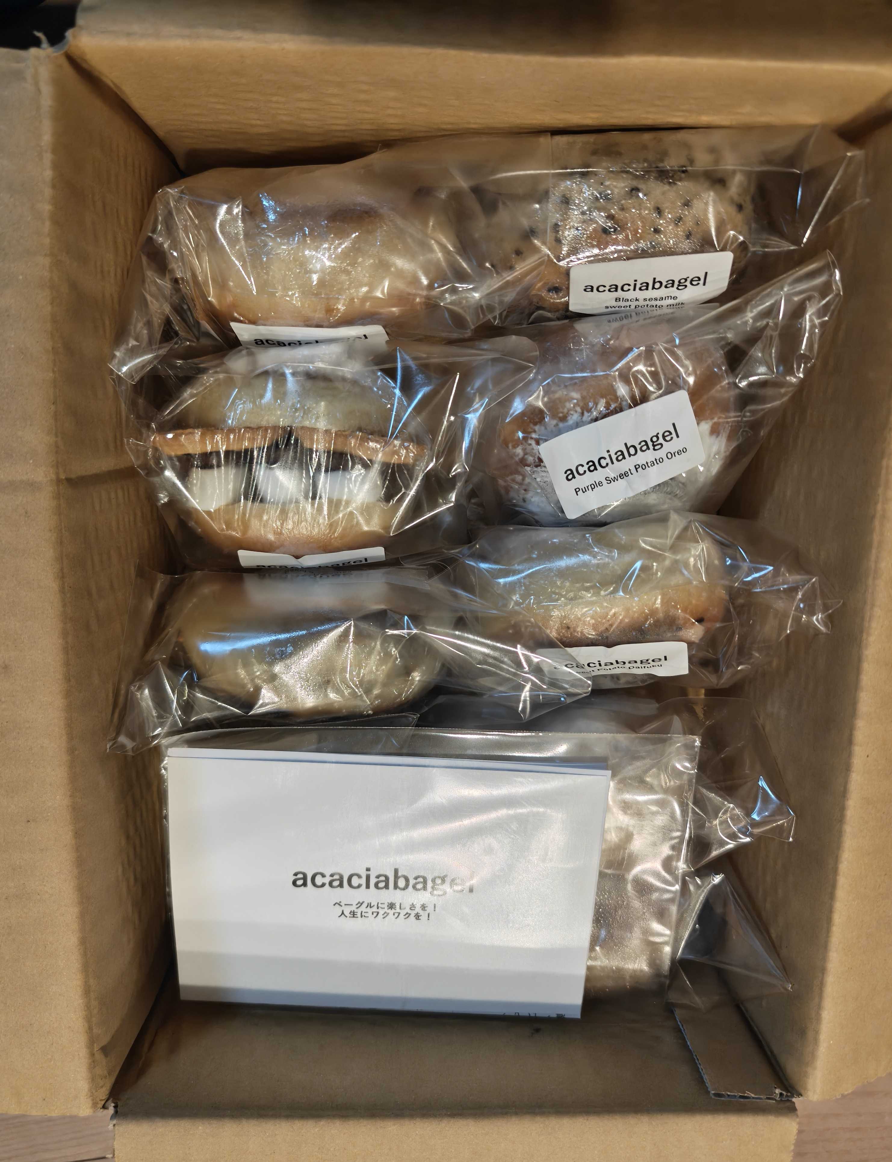 6回目のお取り寄せになる大好きなアカシアベーグル(acaciabagel)さん9月便の募集があった8月27日にオンラインストアで購入、9月13日に発送連絡があって15日に千葉で受け取りましたプレミアム アカシアベーグル8個セット(9月便)(5200円+千葉までのヤマト運輸クール冷凍便送料1370円)〇ロータスシナモン(Lotus Cinnamon)〇黒ごまおさつミルク(Black sesame sweet milk)〇new!チョコバナナ(Chocolate Banana)〇スイートポテト(Sweet Potato)〇おさつ大福(Sweet Potato Daifuku)〇芋オレオ(Purple Sweet Potato Oreo)〇ベーグル・オ・スモア(Bagel o' s'mores)〇禁断のおさつあんバターサンド((Forbitten)Sweet Potato Bean Paste and Butter Sandwich)の8個入り大好きなサツマイモ三昧で楽しみしかないメニュー〇黒ごまおさつミルク(Black sesame sweet milk)自然解凍→20秒レンチン→バシャッと水をかけてからリベイクしていただきましたバリっとしてむっちむちの生地は黒ごまがたっぷりでプチプチしてて、噛むと香ばしくてサツマイモの甘味とぴったりフィリングはサツマイモにホワイトチョコレートリベイクでトロリととけたホワイトチョコレートとしっとり甘い角切りさつま芋さつま芋は角切りでたっぷり入っていて、ペースト状じゃないのに柔らかくて噛まずにホワイトチョコと一緒に飲み物のように生地に馴染んで美味し〇スイートポテト(Sweet Potato)自然解凍→20秒レンチン→霧吹きをしてからリベイクしていただきましたリベイクすると表面の粉糖が薄くカリッカリになってサツマイモと合わさると大学芋みたいむっちむちで程よい噛み応えの生地にたっぷりの角切りさつま芋とクリームチーズ、クラッシュしたバタークッキーが入っています角切りさつま芋はバターとお砂糖で煮ているっぽくって、バターの香りと塩っけが甘味をさらにひきたててくれますクリチの酸味とミルキーな包容力で全体がバランスよくまとまっていて美味しかったです〇ベーグル・オ・スモア(Bagel o' s'mores)冷蔵庫解凍→ラップを外してから600Wレンジで20秒温めていただきましたスモアって歯にくっつくタイプだと苦手鴨と思ったけれど歯にくっつかない良かったwむっちむちで噛むと旨味のあるプレーン生地に森永チョイスビスケットとミルクチョコレートとマシュマロが挟まっていますチョコもマシュマロも全部溶けた感じになって甘味と香りの広がりがジュワジュワと強め生地にも染みて良いしっとりホロサクのチョイスビスケットのバター感も相まって背徳的な美味しさ難点はポタポタと皿にも手にもこぼれて、息子に「いっぱいこぼしてるよ」と言われたことだけwww〇禁断のおさつあんバターサンド((Forbitten)Sweet Potato Bean Paste and Butter Sandwich)ベーグルは塩バターベーグル写真みたいにたっぷり空洞が出来るくらいジュワっとバターが入った贅沢ベーグルベーグルは自然解凍→20秒レンチン→バシャッと水をかけてからリベイクして、冷蔵庫解凍したおさつあんとバターを挟んでいただきましたカリッと焦げるまで焼いた生地は中はむちぃっとしてバターがジュワっと練りこまれていて、更にサンドしたバターもジュワジュワっと染みて、滑らかなおさつ餡は甘くて…甘い↔しょっぱいが続く幸せの味バターの塩っけでおさつあんのねっとり甘味の濃厚さが際立ちます冷えた餡子と段々と溶けていくバターと温かいバリムチの生地の組み合わせも良き…生地の外に染み出たバターが溶けてカリッとしているところが特にめちゃくちゃ美味しいのよねこれも手がめっちゃバターでベトベトになるけど、禁断系ベーグルはもう気にしない〇おさつ大福(Sweet Potato Daifuku)自然解凍→20秒レンチン→バシャッと水をかけてからリベイクしていただきました上手に焼けて表面はバリっとめっちゃ香ばしく中はむちもちっ禁断のおさつあんバターサンドに入っていたのとたぶん同じ(とか言いつつ違うかも)滑らかさつまいも餡、クリチ、胡麻、白玉2粒が巻き込まれていて、サツマイモと白玉と胡麻がトッピングされていますむっちもちの生地にもちもちゅの白玉入りって、もちもち好きにとって嬉しい組み合わせ単品でも美味しいさつまいも餡にクリチのサッパリ感が加わってまた美味し〇芋オレオ(Purple Sweet Potato Oreo)自然解凍→20秒レンチン→バシャッと水をかけてからリベイクしていただきました表面パリッとして中はムチィっとしたむらさきいも生地に、むらさきいもあんとクリームチーズとクラッシュオレオが巻き込まれていて、オレオと粉糖がトッピングボーっと食べてたら生地の紫芋味を忘れてたけど記事だけで食べると優しい甘味があって確かにサツマイモ甘いサツマイモ餡とさっぱりクリチに、時々オレオの甘いけどビターな感じがあっていて、それぞれに引き立てあっています〇ロータスシナモン(Lotus Cinnamon)自然解凍→20秒レンチン→霧吹きをしてからリベイクしていただきましたバリムチの美味しいプレーン生地にたっぷりのシナモンシュガーとクリチが巻き込まれていて、ロータスビスコフとシナモンシュガーのト