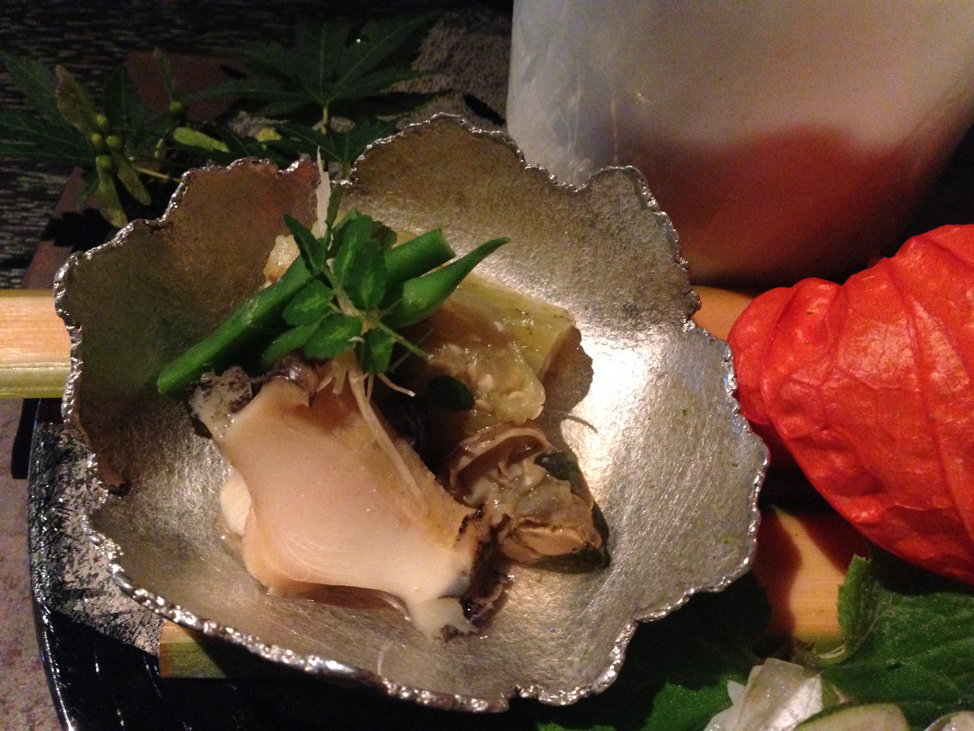 ④アワビ、インゲン、ずいきなどを優しいお出汁で煮たもの