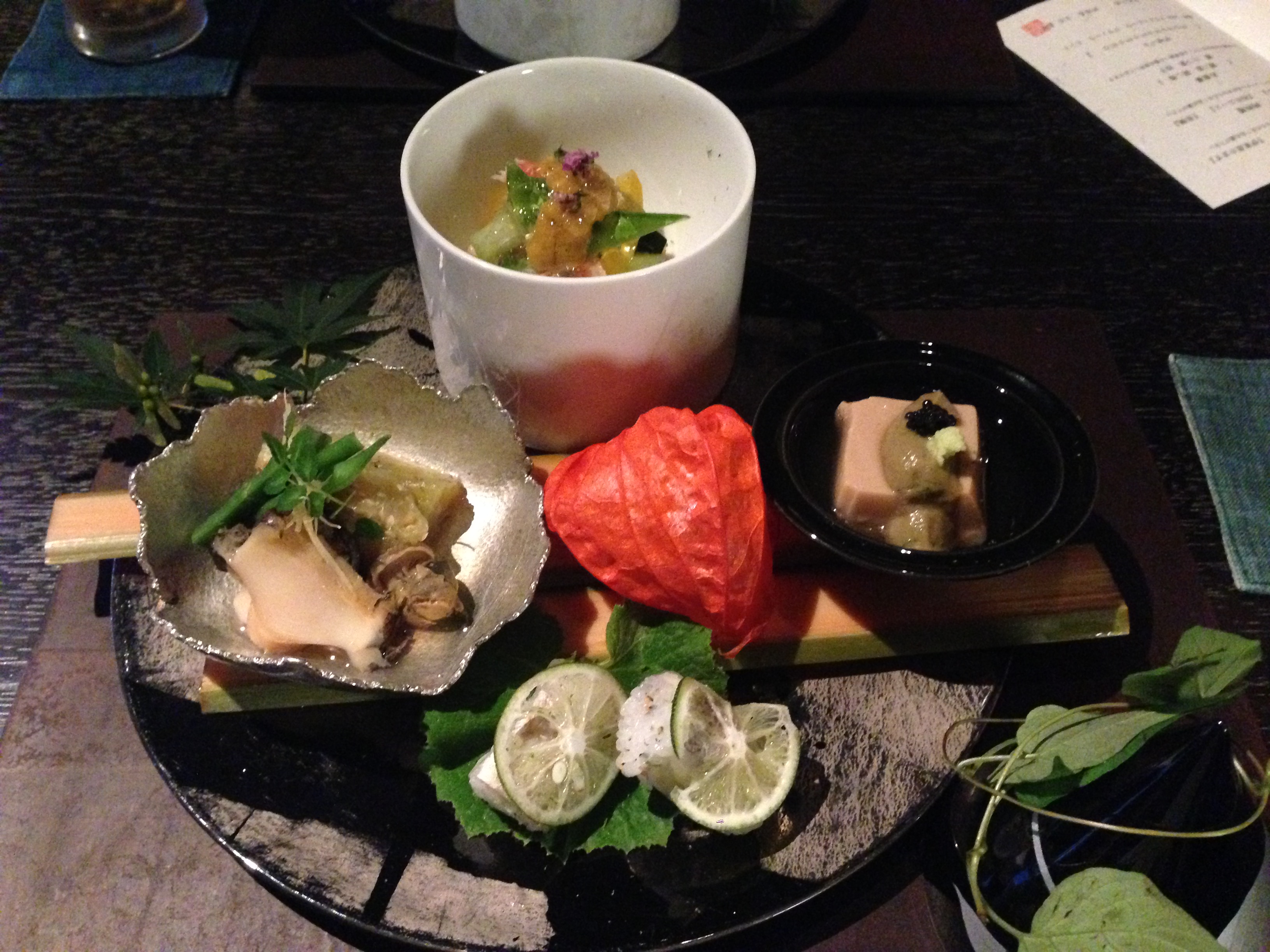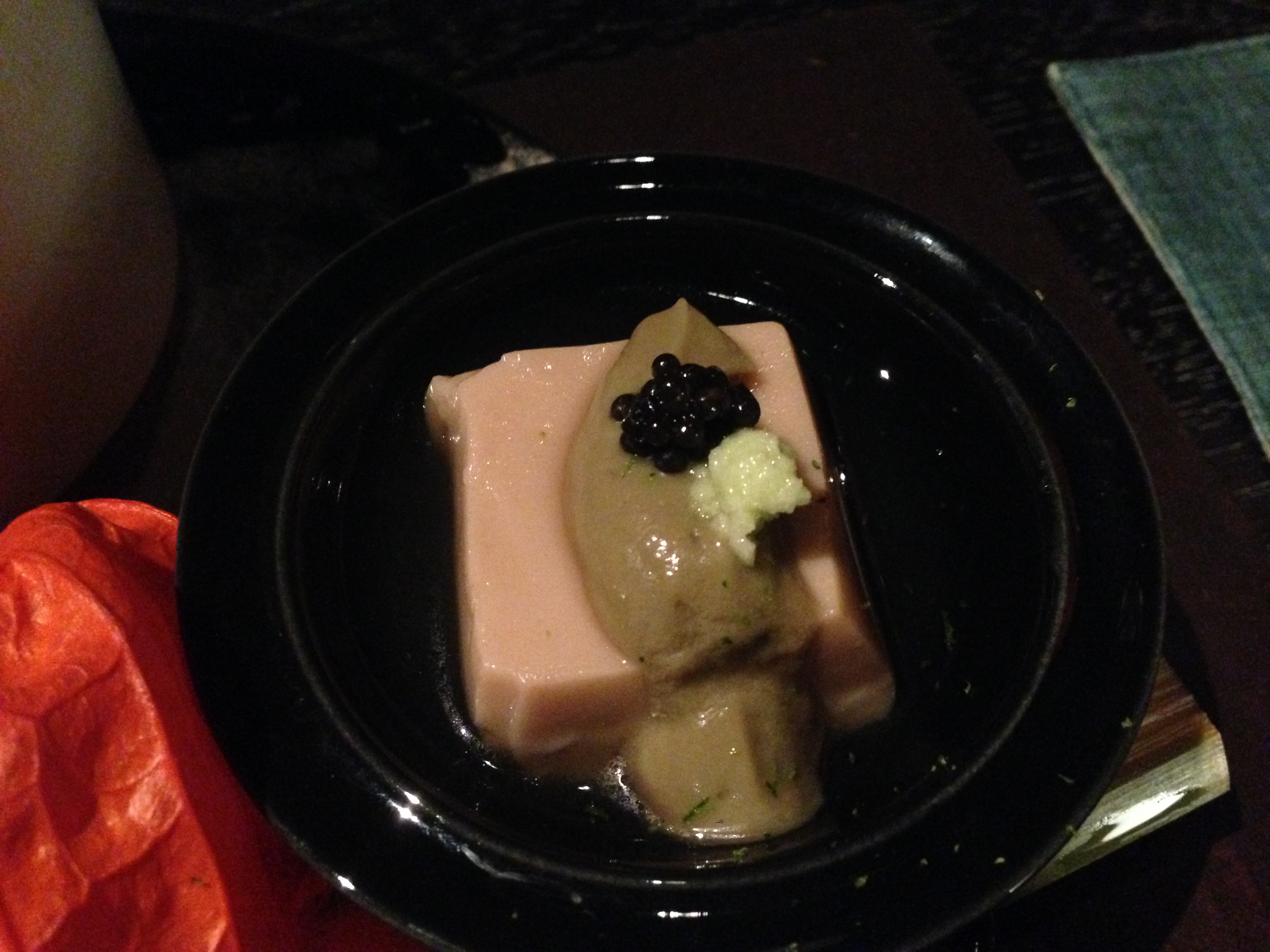 ①自家製のもっちり胡麻豆腐にアボカドやキャビアが載ったもの