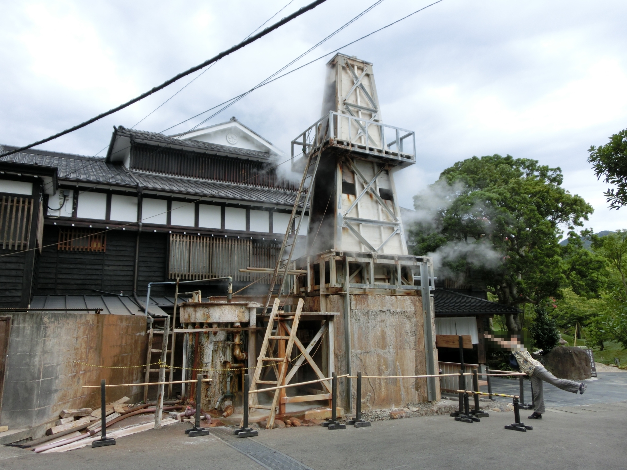 湯気が噴き出す大きな源泉櫓びっくり