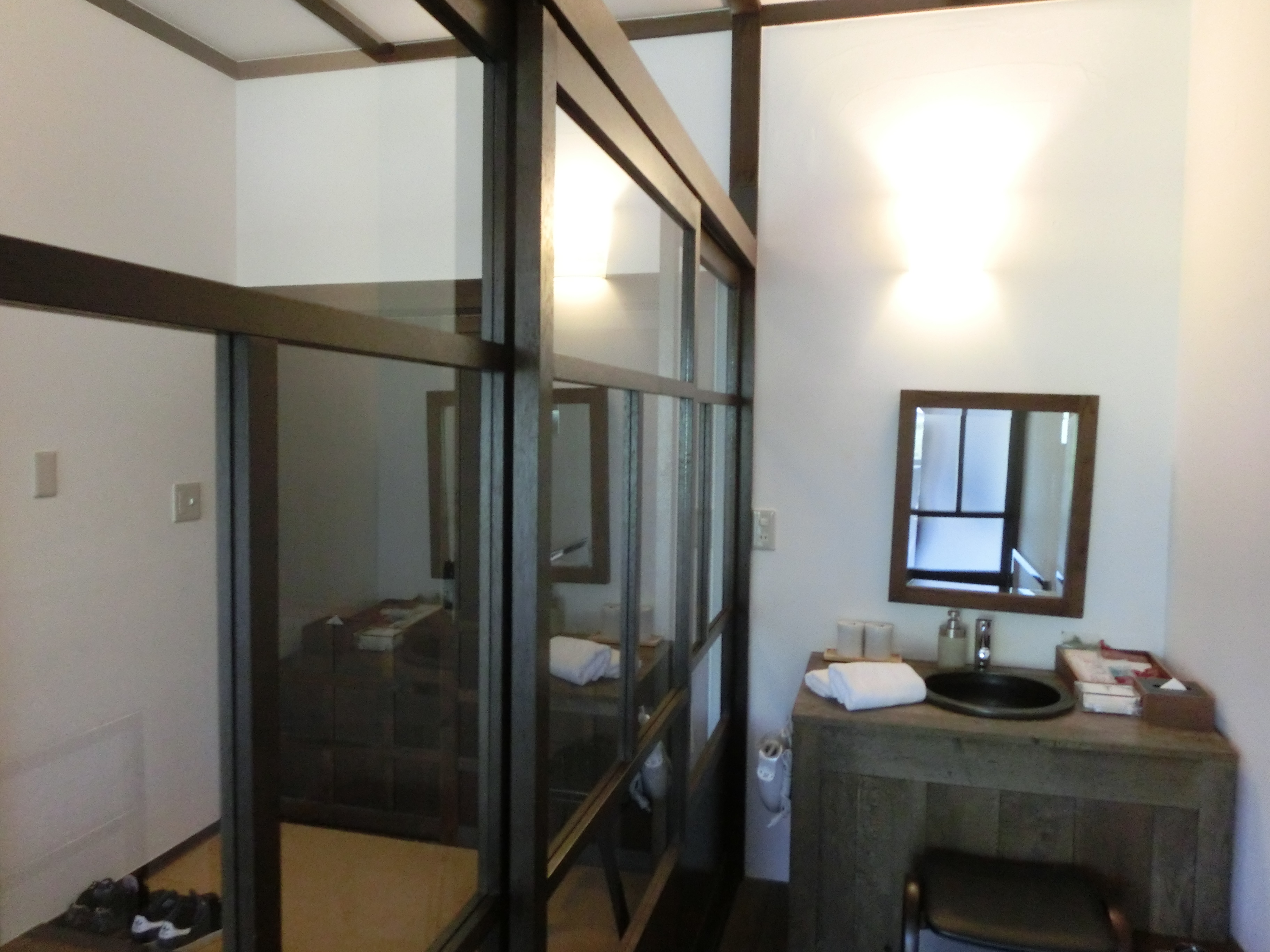 この上の写真の右奥のガラス扉が洗面所で、